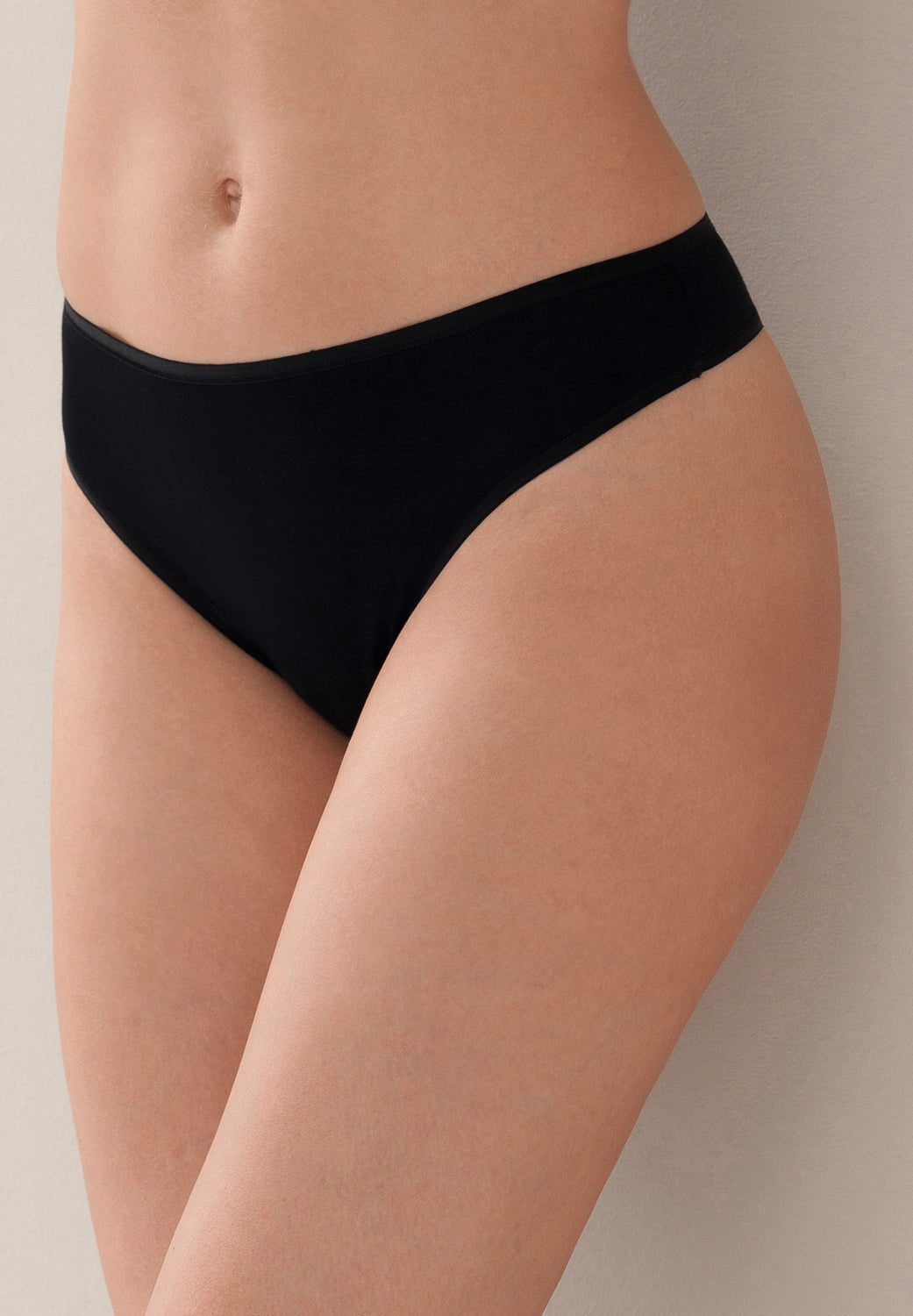 Very delicate thong made from an exquisite blend of MicroModal and elastane. The MicroModal is obtained from sustainably produced, natural beechwood fibres and is characterised by being exceptionally breathable and offering good temperature regulation. MicroModal can absorb up to 50% more moisture than other varieties of cotton. In addition, this material is as soft as silk and has a beautiful drape. MicroModal and elastane are further processed here to create a high-quality single jersey fabric for this thong. This single jersey is very stretchy and thin. At the same time, the material is very durable and keeps its shape well. The thong has a cotton gusset for guaranteed comfort and comes in a classic design with high legs and a low waist. The elastane component ensures the garment keeps its shape in the long term and also supports the figure-hugging shape. So, this thong hugs the body like a second skin, emphasising the female figure in a beautifully flattering manner. The trim around the waistband and legs is narrow and lies beautifully flat. Nothing will be visible when wearing this thong. It makes a wonderful, exclusive basic item and is also perfect under tight-fitting evening dress.